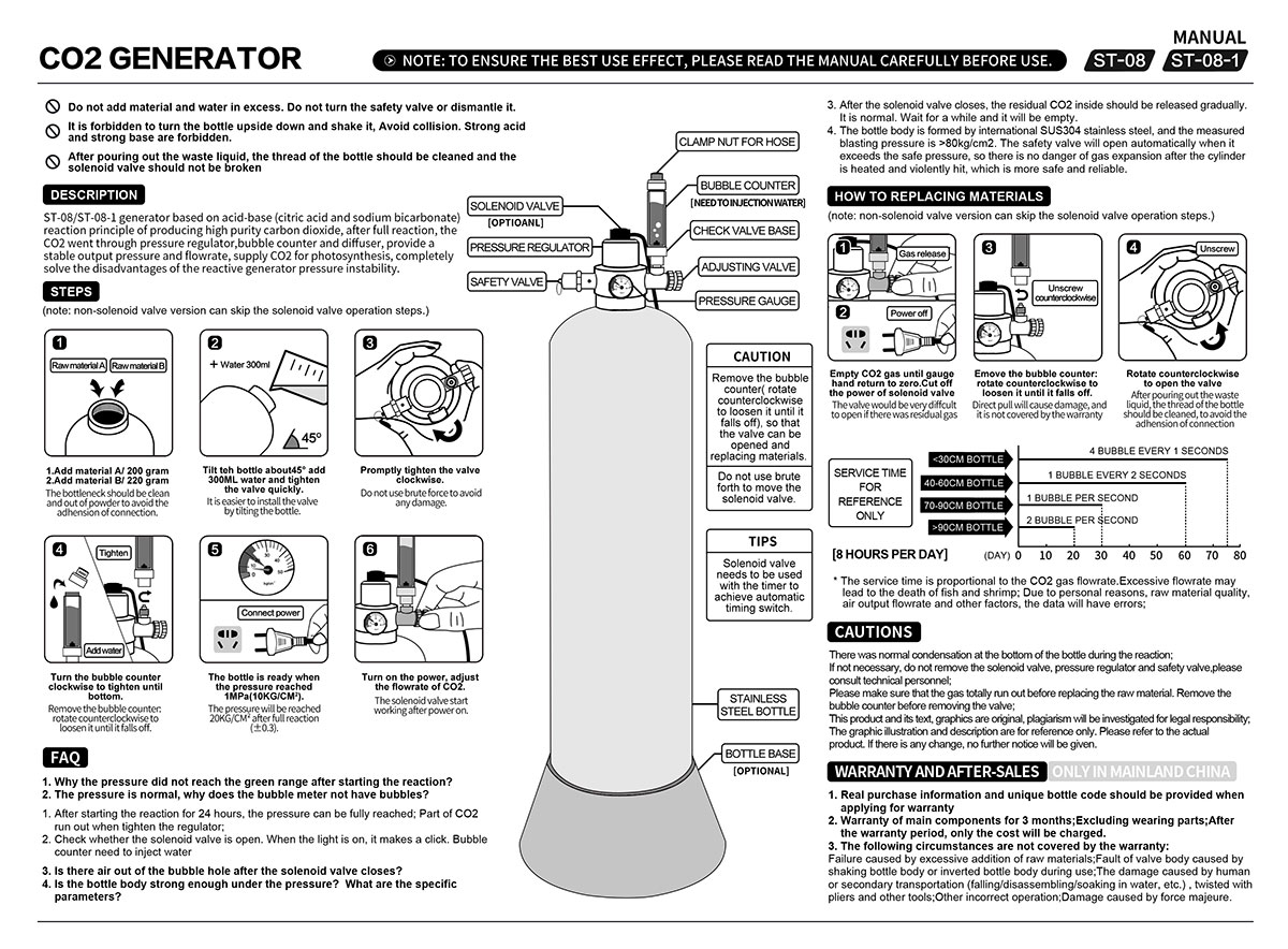 ST-08-1-akvaarion CO2-generaattori hyödyntää happo-emäs-reaktion periaatetta, jolloin sitruunahappo reagoi natriumbikarbonaatin kanssa tuottaakseen erittäin puhdasta CO2:ta. Tieteellisesti muotoillun kaavan ja tehokkaan reaktioprosessin ansiosta laite vapauttaa tasaisesti CO2:ta, joka tarjoaa jatkuvan kaasunsyötön akvaariokasveille, täyttää niiden fotosynteesitarpeet ja edistää tervettä kasvua. Perinteisiin reaktiotyyppisiin generaattoreihin verrattuna ST-08-1:ssä on parannettu paineenhallinta. Varustettu erillisellä paineensäätimellä, kuplalaskimella ja diffuusorilla, se tarjoaa vakaan ulostulopaineen ja tasaisen kupladispersion eliminoiden paineenvaihteluista aiheutuvat haitat.